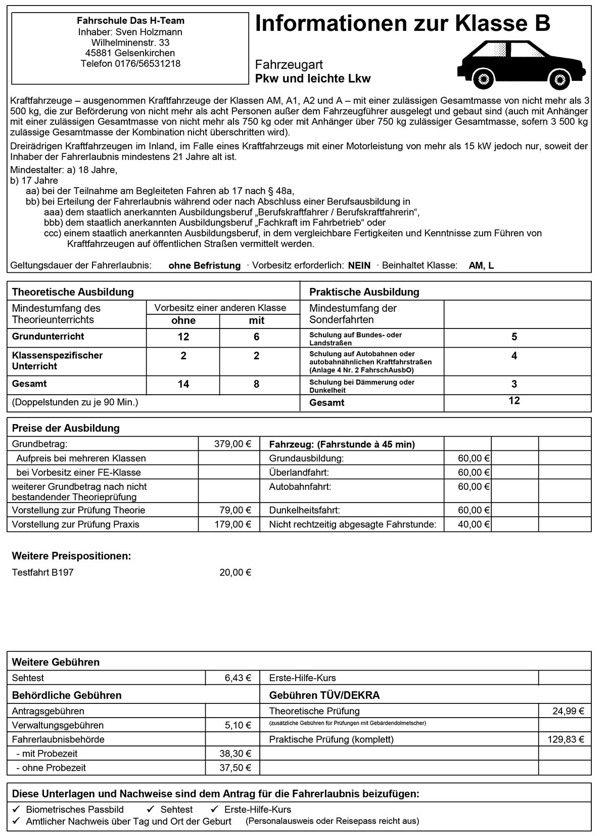 Der klassische PKW-Führerschein (Klasse B) zum Führen von PKW und leichten LKW, Mindestalter 17 Jahre, Informationen zur Automatik-Regelung (B197) findest du hier, weitere Informationen und Preise für Gelsenkirchen hier und für Herten hier.